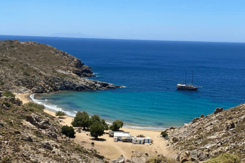 Pero créeme, el esfuerzo vale la pena. Arena dorada, agua cristalina y un silencio que te envuelve. No hay muchas playas así en el Egeo.